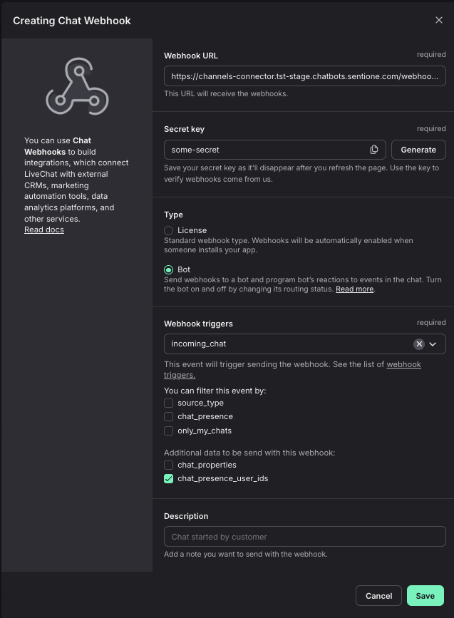 - Webhook URL - point on channels-connector application domain with endpoint webhooks/livechat,
